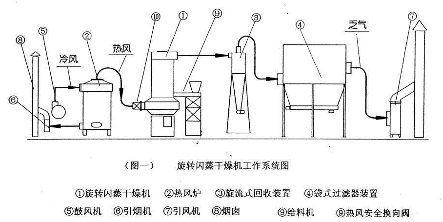 闪蒸干燥是将固体完全流态化的一种干燥方式,干燥主机具有机械、气流分散、干燥物料的压力调整功能,将含湿膏糊状、滤饼状物料加入干燥主机后与热介质混合,物料在热风与机械分散力作用下形成双旋流颗粒状流态化状态,瞬间完成热质交换,干燥后的物料进入捕集器获得粉状产品。
