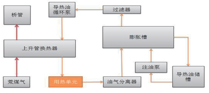 辅助设备。通过上升管导热油换热器将荒煤气的中高温余热进行回收,换热后的高温导热油作为供